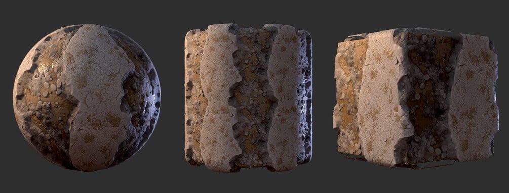 Material previews rendered in Marmoset Toolbag, visual results may vary depending on render engine, tiling amount, lighting conditions, etc. sbsar file performance may differ based on your pc specs.