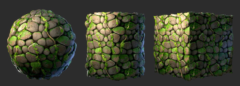 Material previews rendered in Marmoset Toolbag, visual results may vary depending on render engine, tiling amount, lighting conditions, etc. sbsar file performance may differ based on your pc specs.
